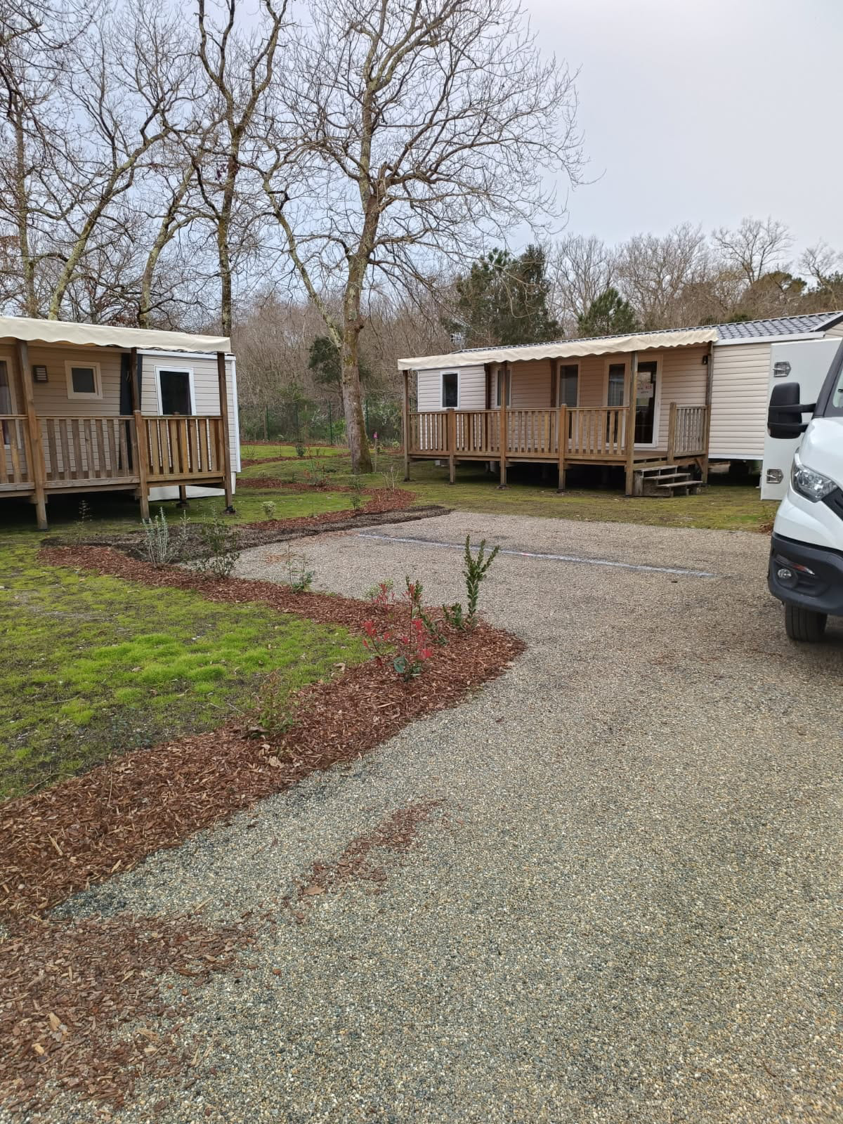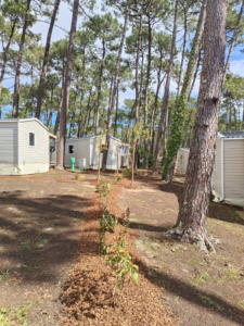 Réalisation complète des aménagements extérieurs du camping : apport de compost, engazonnement, plantations (y compris haies), paillage, installation d’un système d’arrosage et pose de ganivelles.