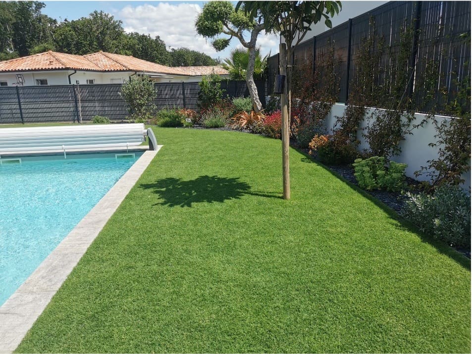 Réalisation de l’aménagement d’un jardin : pose de gazon en plaque, création de massifs, pose de bordures, arrosage.