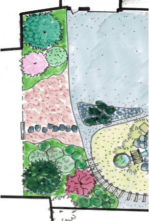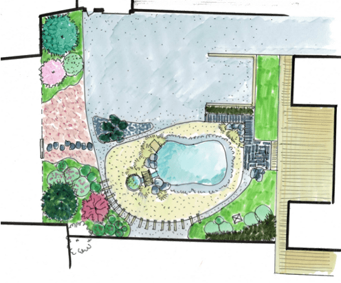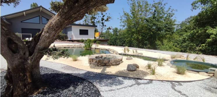 Conception et réalisation de l’aménagement d’un jardin style japonais : terrassement, bordures, clôtures, paillage minéral, plantations.