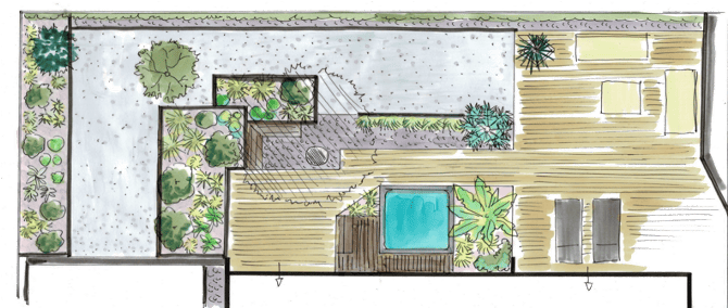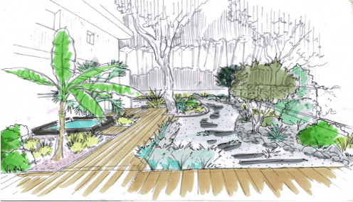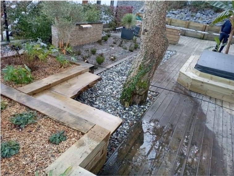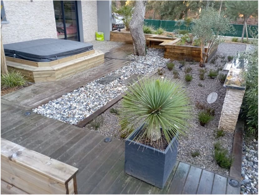 Réalisation de l’aménagement d’un jardin : traitement d’un talus, berlinoise, constructions bois, construction d’une fontaine, éclairage, paillage minéral et organique, plantations, arrosage.