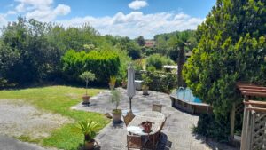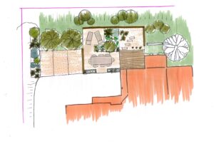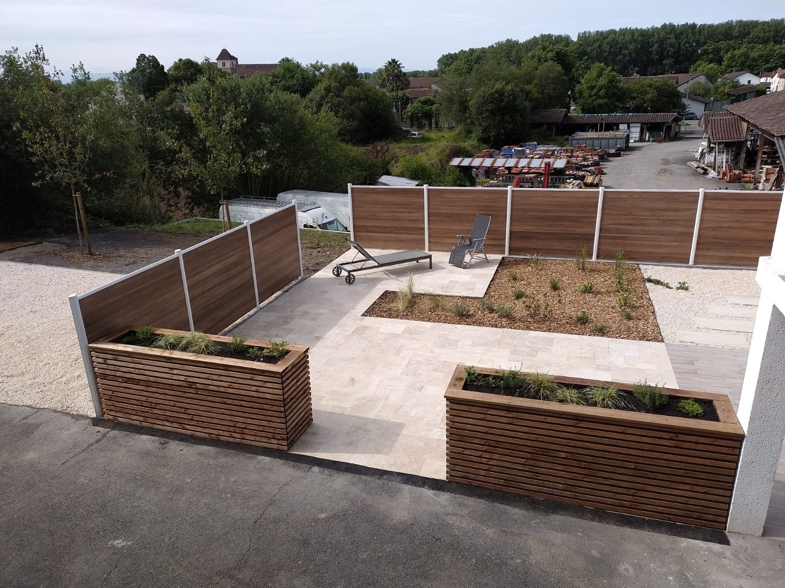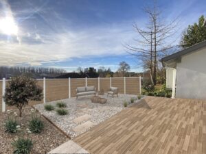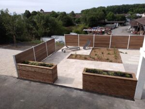 Conception et réalisation d’un espace de détente comprenant une terrasse, des palissades et un espace de plantations.
