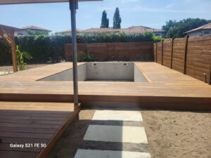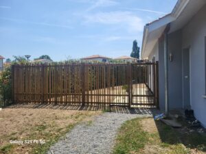 Conception et réalisation d’un jardin paysager comprenant une terrasse en bois, une pergola, des palissades, des portions décoratives ainsi que des massifs végétalisés avec plantations et paillage.